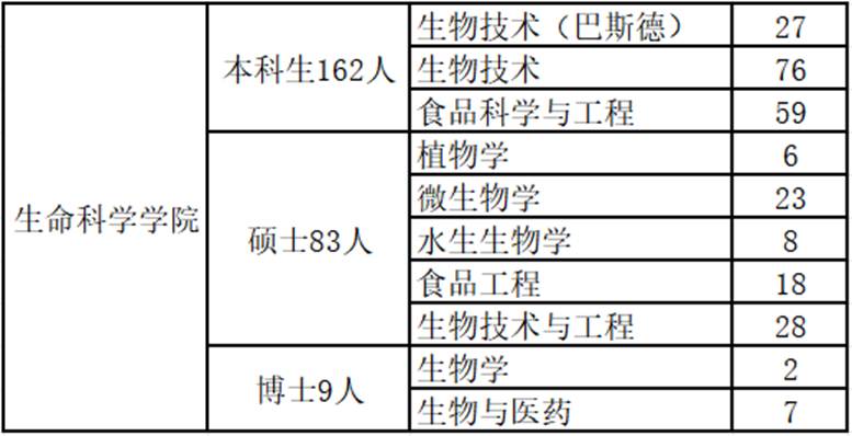 生物学实验教学中心等教学管理机构,设有生物医学工程研究院、水生生物技术研究院、前沿交叉学科研究院、化学生物学与生物传感研究所、天然色素研究所、功能性食品与健康应用研究中心等科研机构